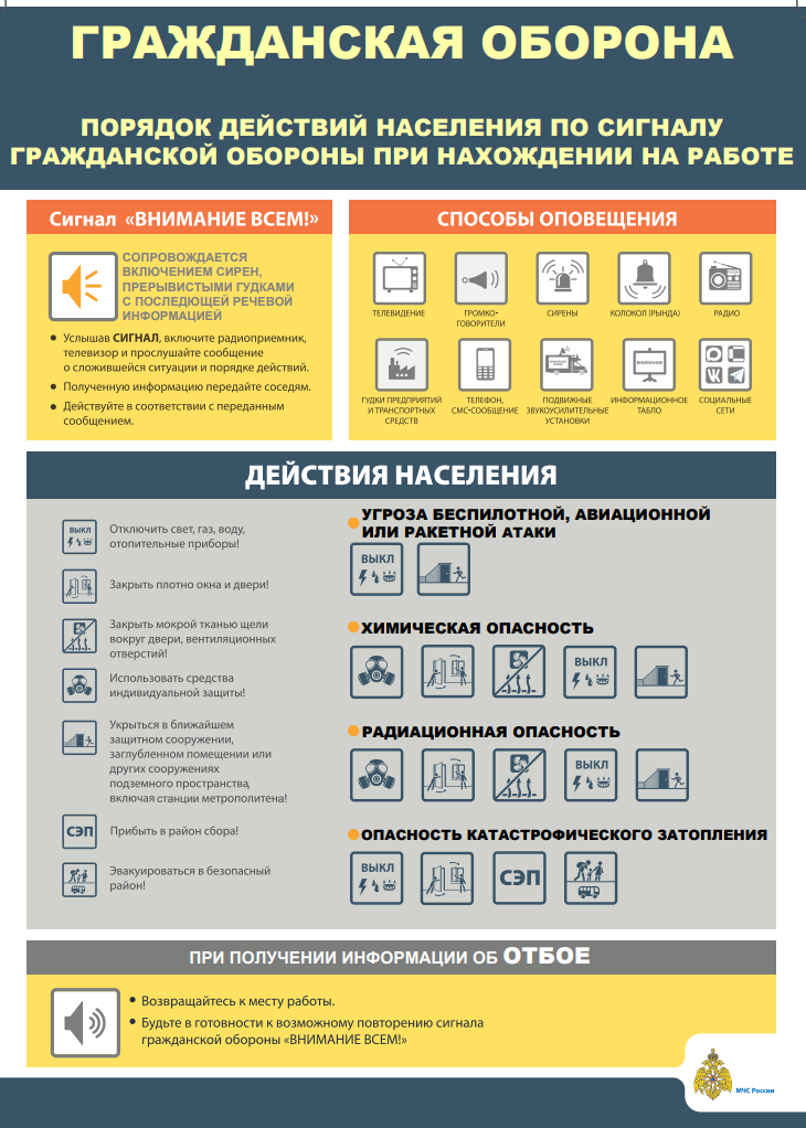 ПОРЯДОК ДЕЙСТВИЙ НАСЕЛЕНИЯ ПО СИГНАЛУ ГРАЖДАНСКОЙ ОБОРОНЫ ПРИ НАХОЖДЕНИИ НА РАБОТЕ 10/10/2025 В памятке вы найдете способы оповещения, действия населения и что делать при получении информации об отбое. Все новости